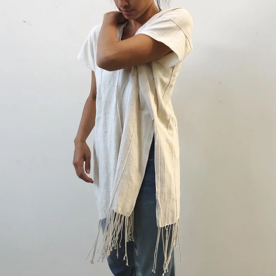 W love this beautiful one-of-a-kind tunic with deep side vents that come up to the natural waist and 9' tassels! Great paired with your favorite high waist bottoms.