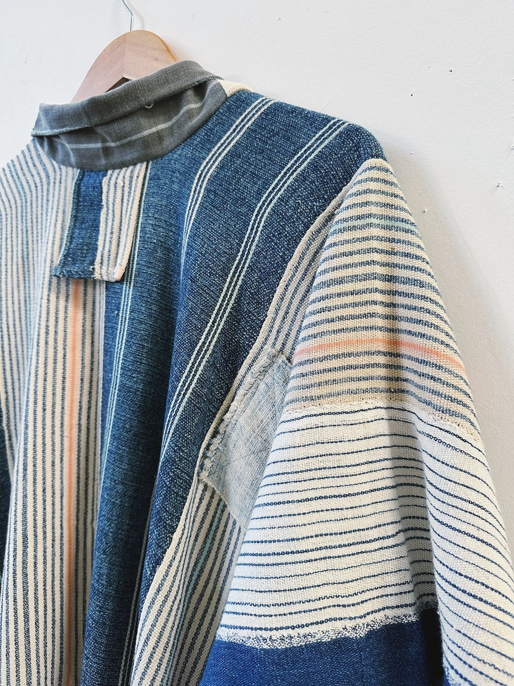 We're OBSESSED with this incredible one of a kind piece. The incredibly soft drape, the contrasting stripes, the patching. There is no such thing as too much of a good thing and this piece proves it!