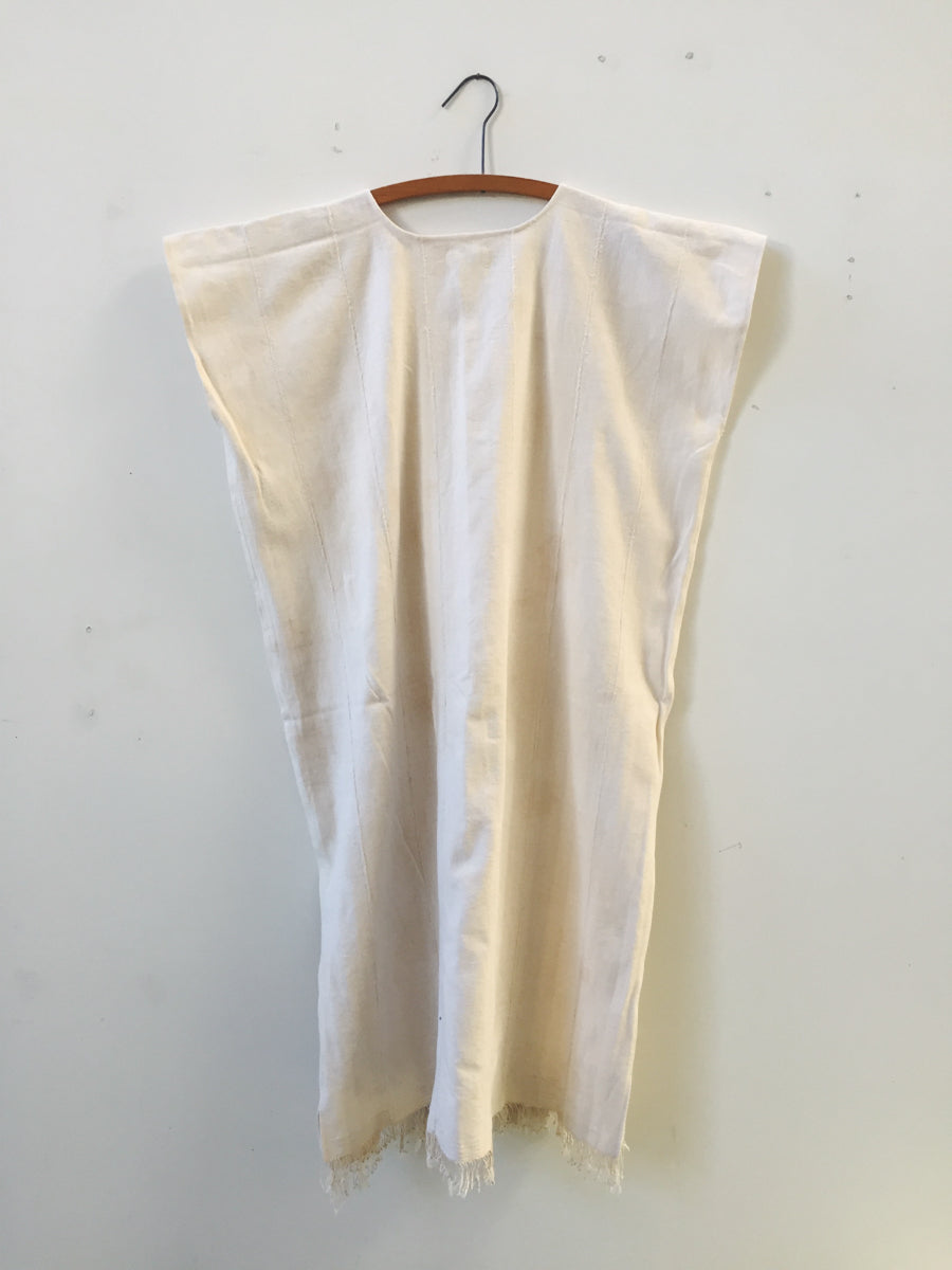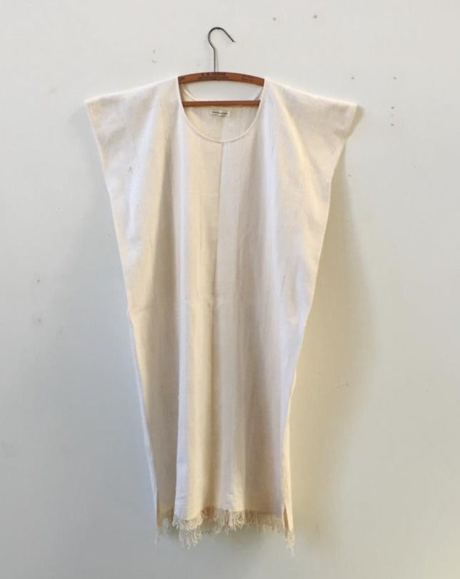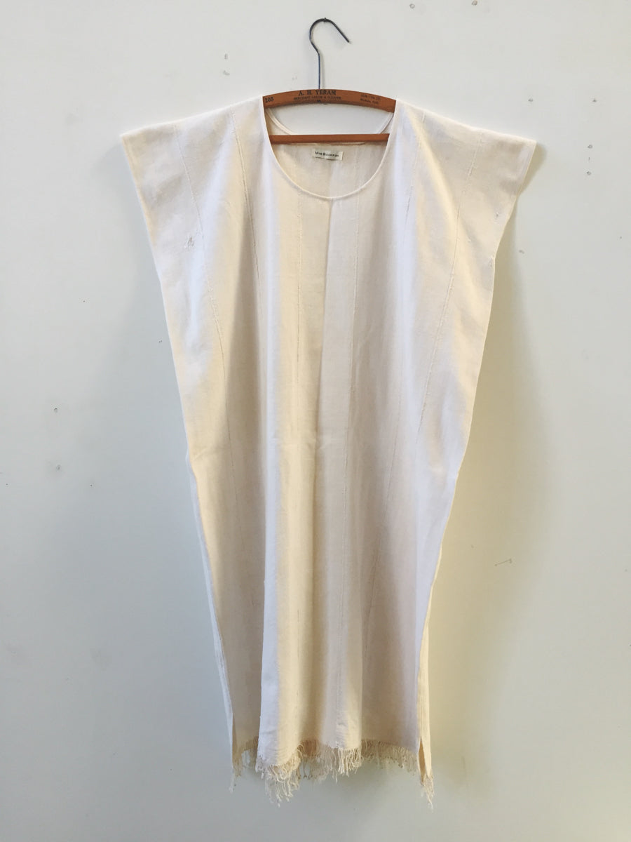 We love the rich texture on this handwoven dress. It's longer than the one pictured on the model but we wanted you to get a sense of it on- because hanging flat really doesn't do it justice! One of a kind handwoven scoop neck dress with hand twisted tassel trim.