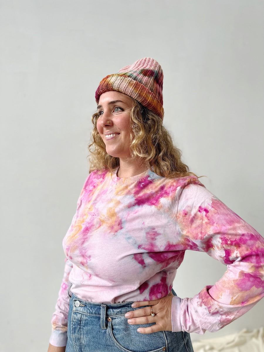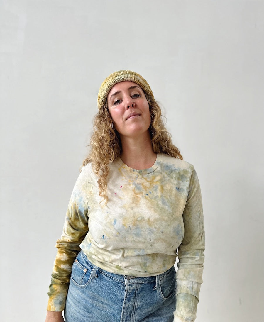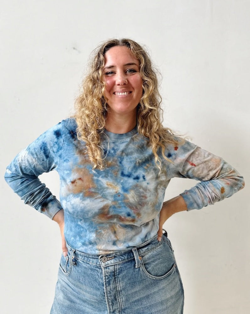 These pieces are dyed by hand in our backyard studio. Every element from the temperature that day, to the way the wind is blowing, affects the way they come out. It's a truly magical and collaborative process.