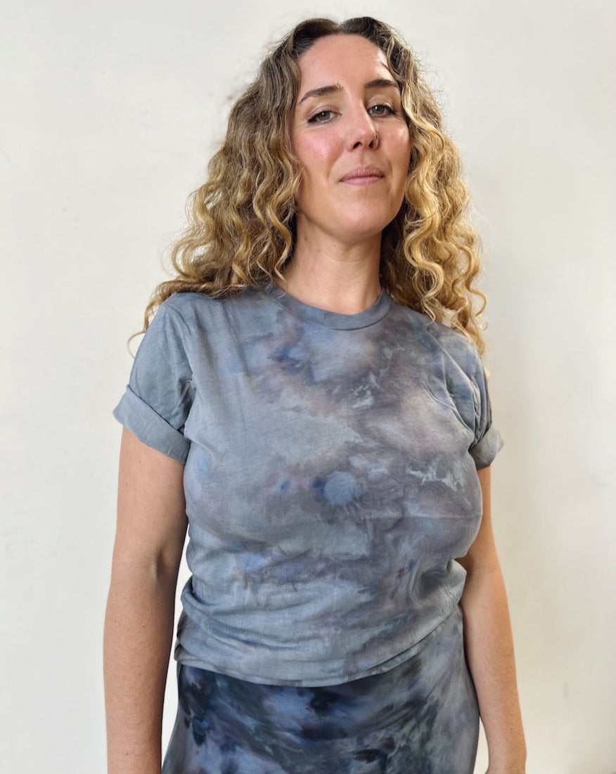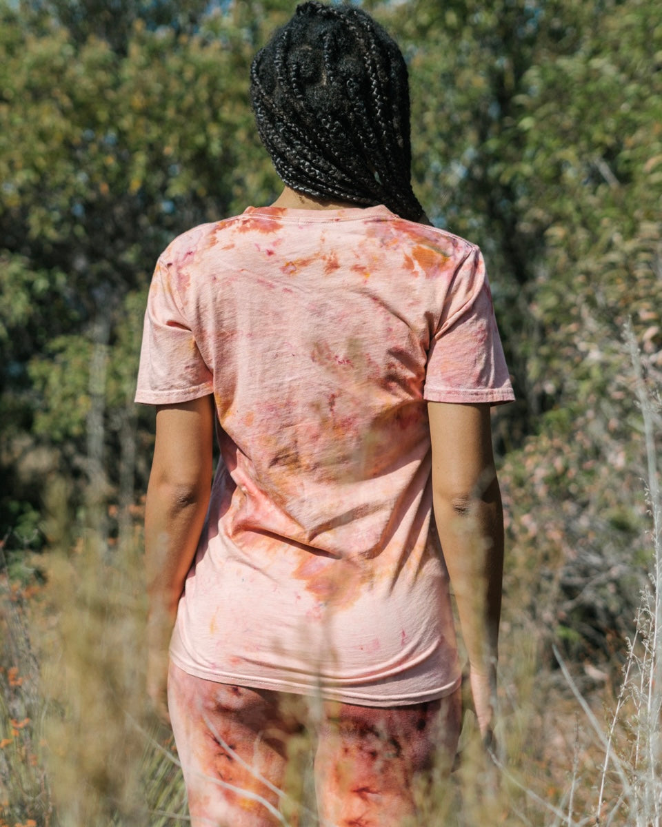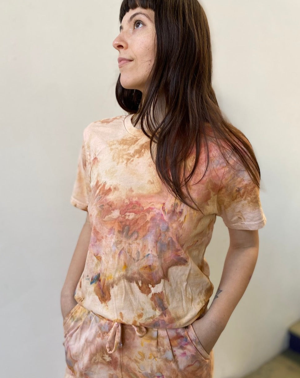 These pieces are dyed by hand in our backyard studio. Every element from the temperature that day, to the way the wind is blowing, affects they way they come out. It's a truly magical and collaborative process.