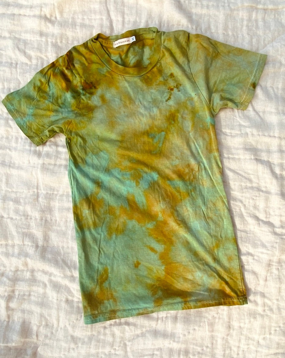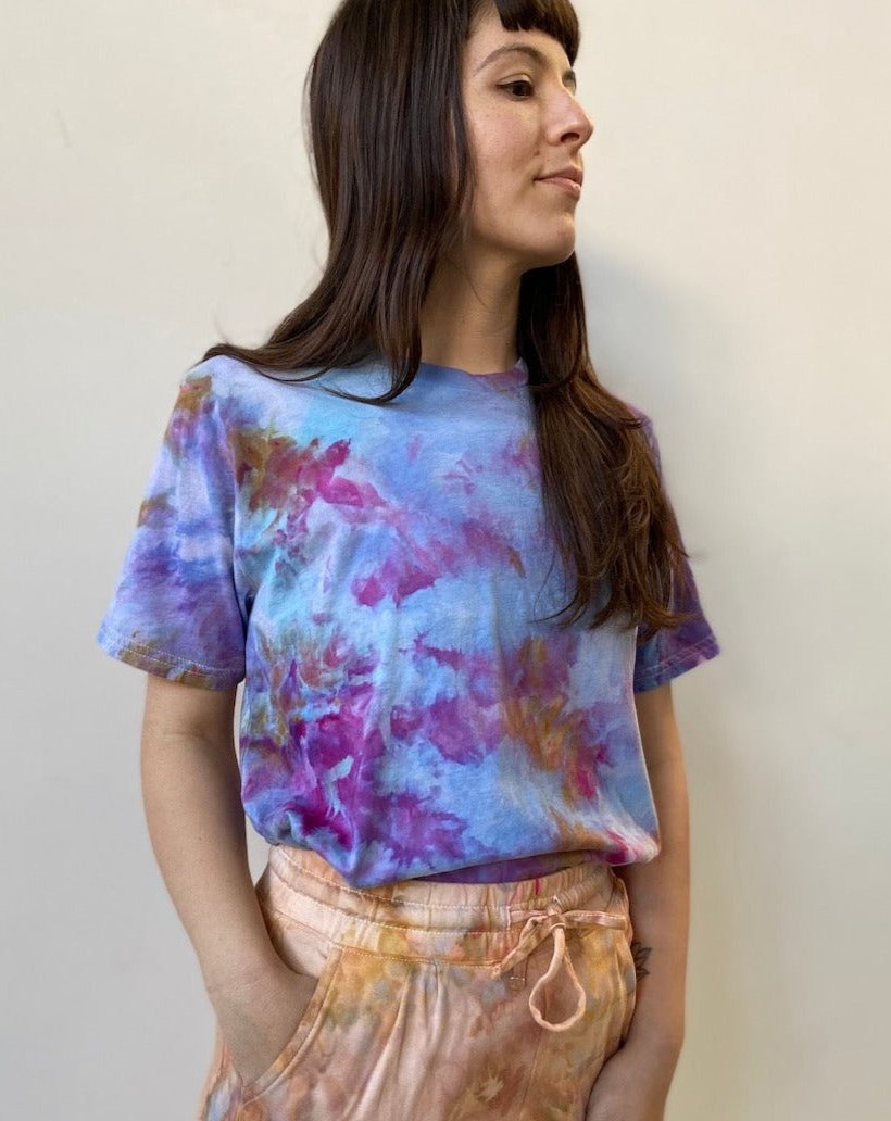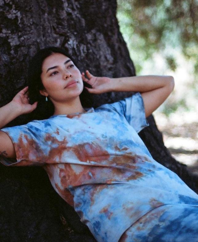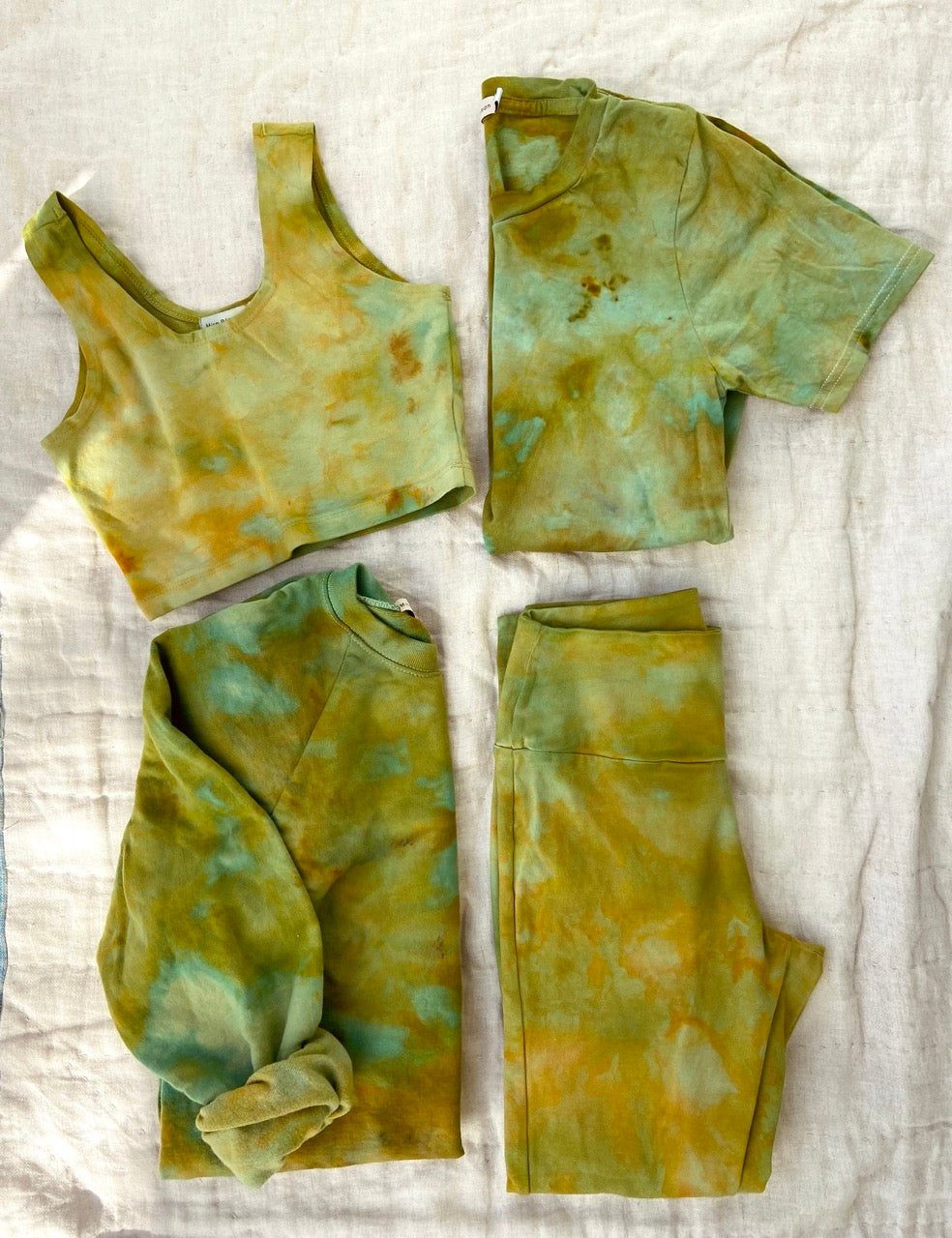 These pieces are dyed by hand in our backyard studio. Every element from the temperature that day, to the way the wind is blowing, affects they way they come out. It's a truly magical and collaborative process.